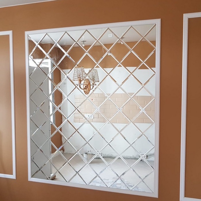 Использована квадратная серебристая зеркальная плитка размером 18х18.